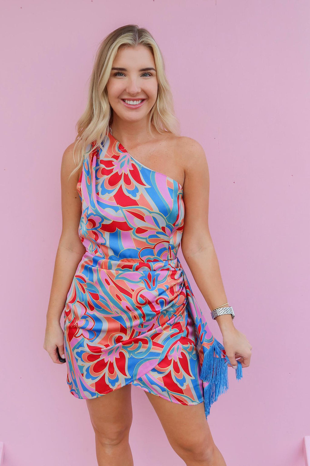 Karlie Abstract Satin One Shoulder Fringe Dress. FINAL SALE