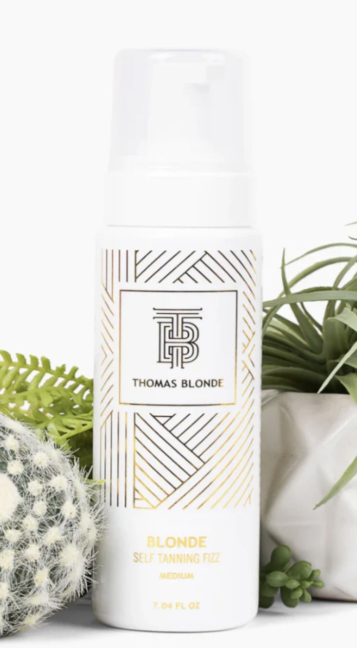 Thomas Blonde Tanning Fizz is scented with our signature scent Blonde. It is vegan free and and highly pigmented for even the fairest of skin tones. The color is so natural that it doesn't look fake or orange. Being a fair skinned blonde myself I have tried numerous self tanners. I finally decided to create my own line with a very natural color tone, easier application process (no streaking) and enough pigment to cover the lightest of skin tones.
