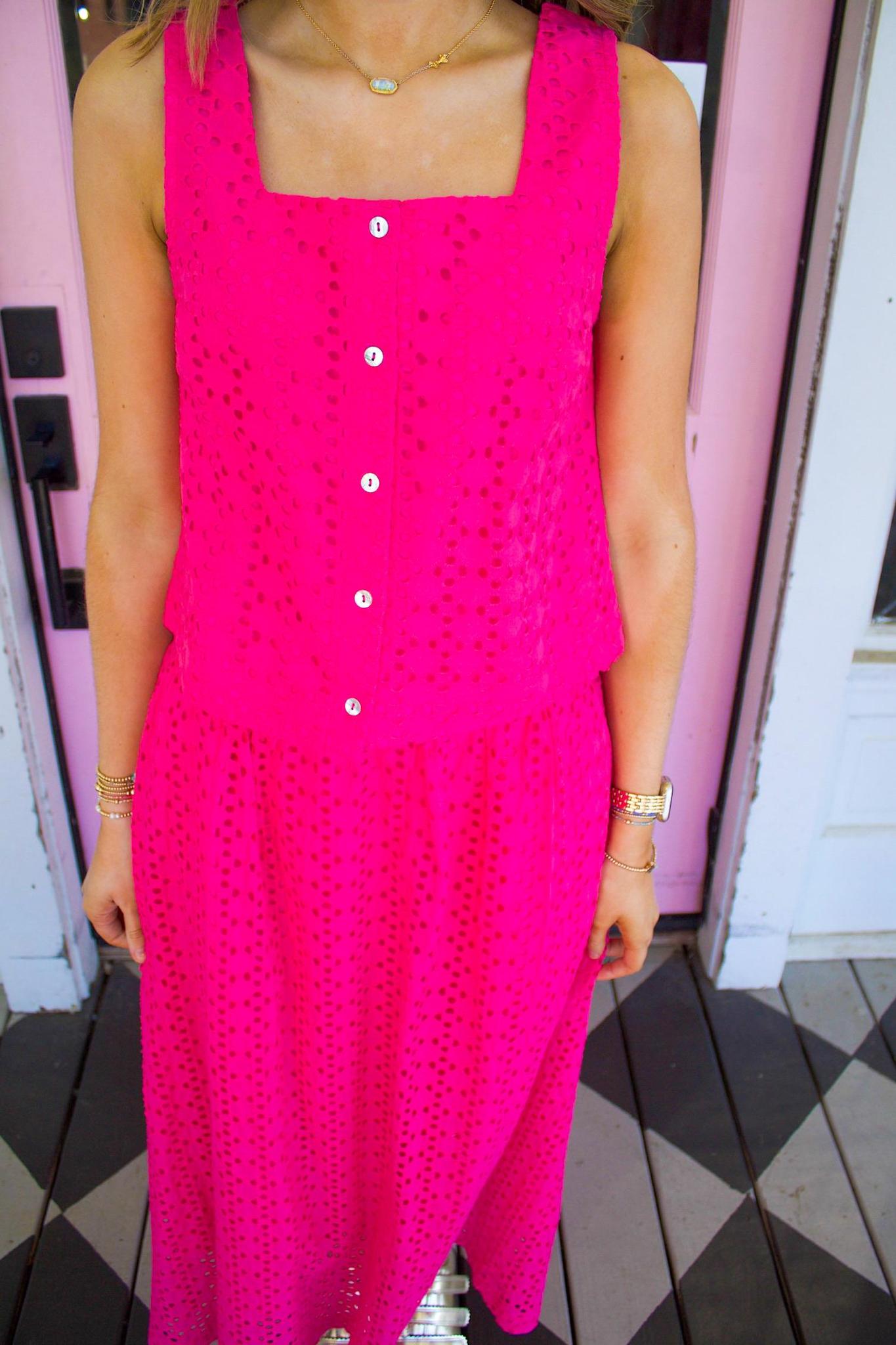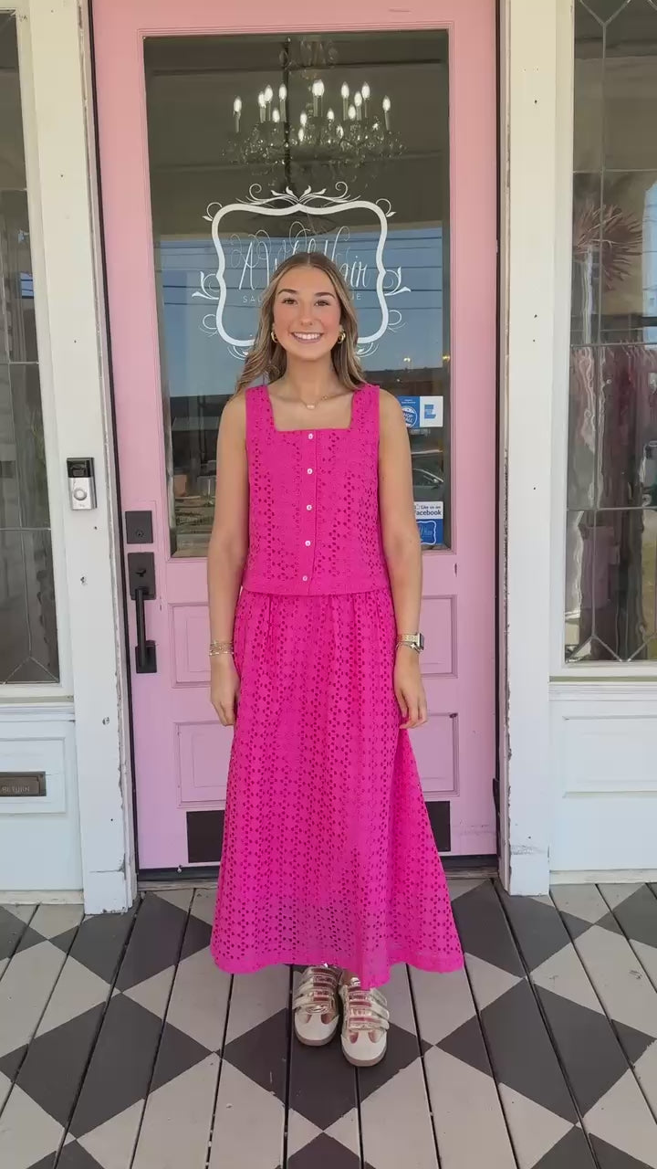 Eyelet sleeveless top featuring button closure at front. Lined. Woven. Non-sheer. Lightweight.