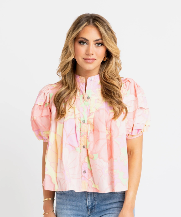 Karlie Big Floral Pastel Pleat Sleeve Top