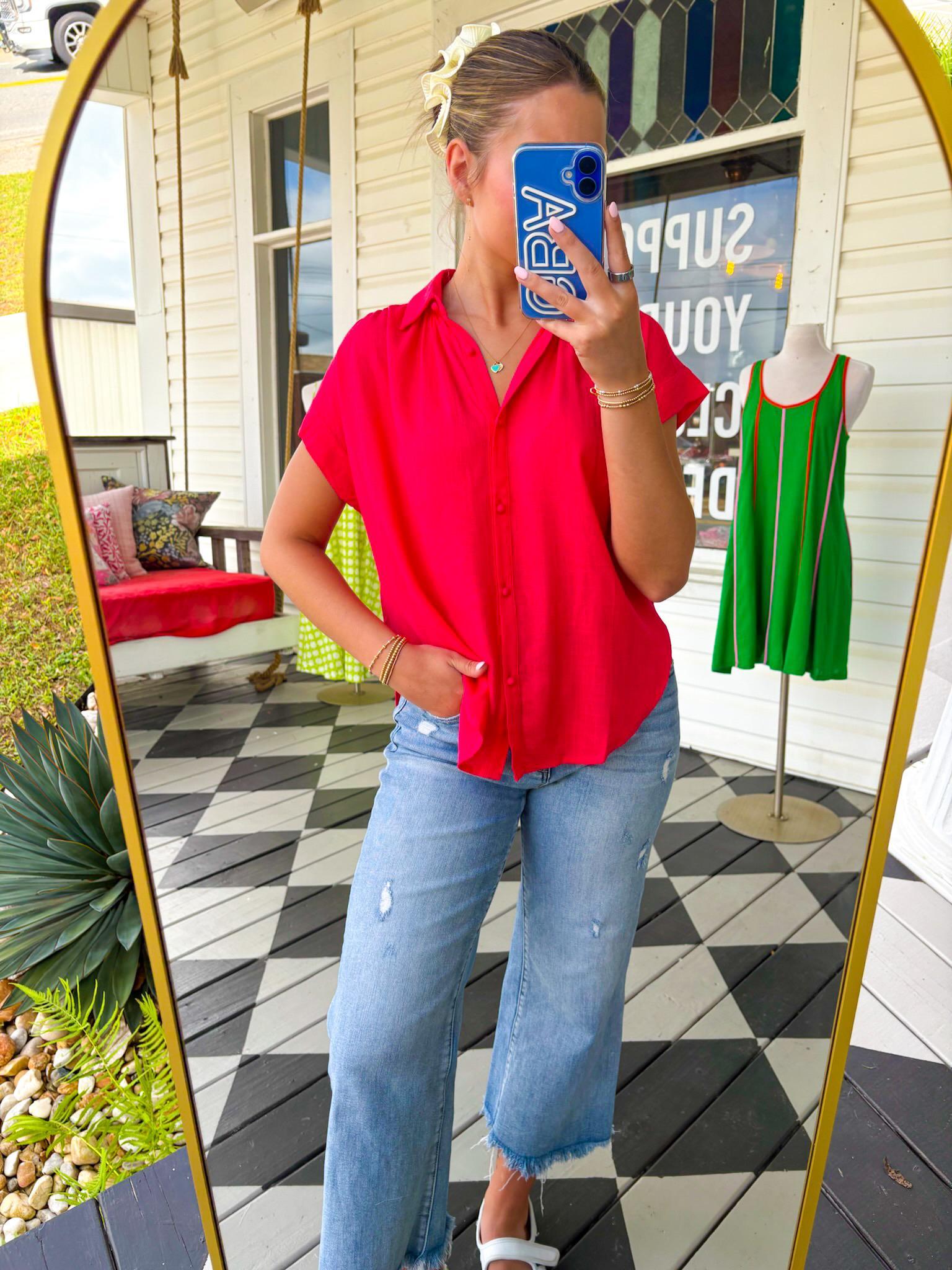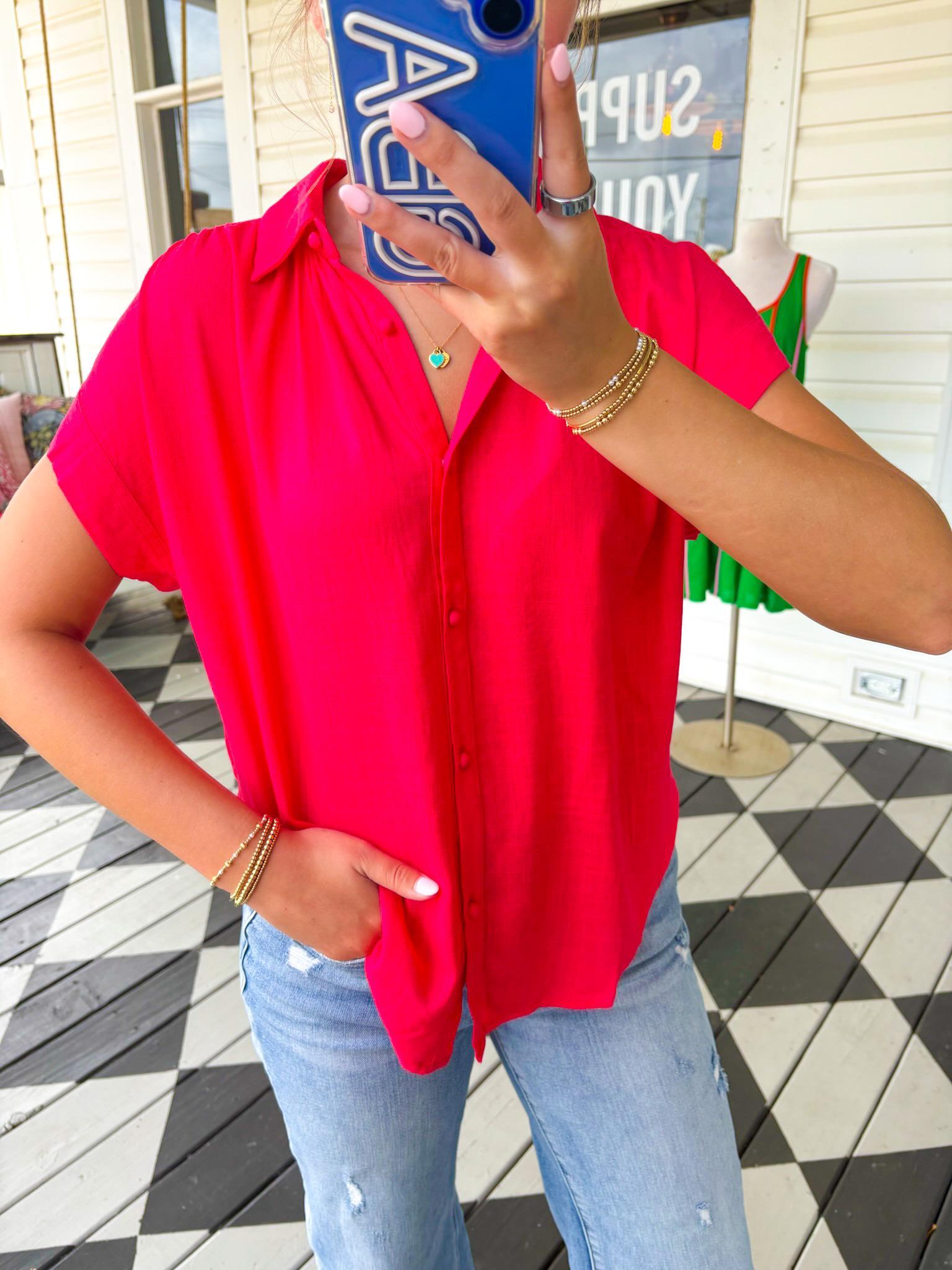 Our Melissa Top features a short sleeve and a button-down Woven.