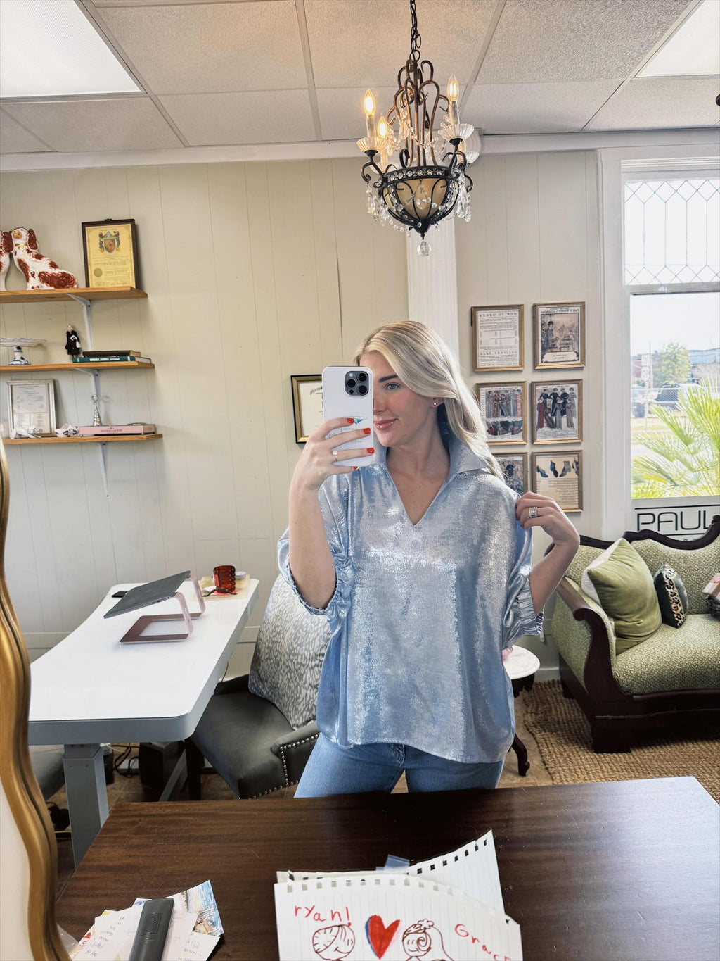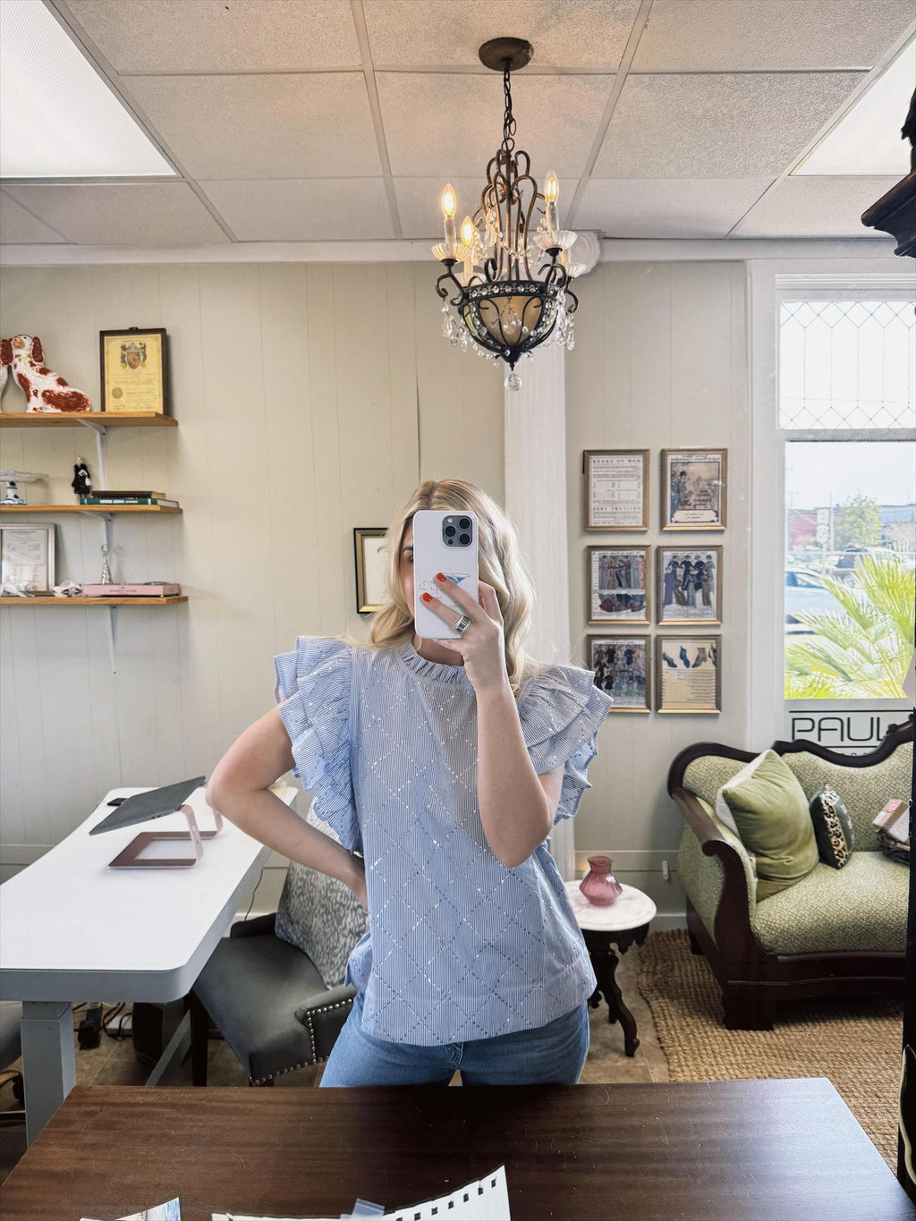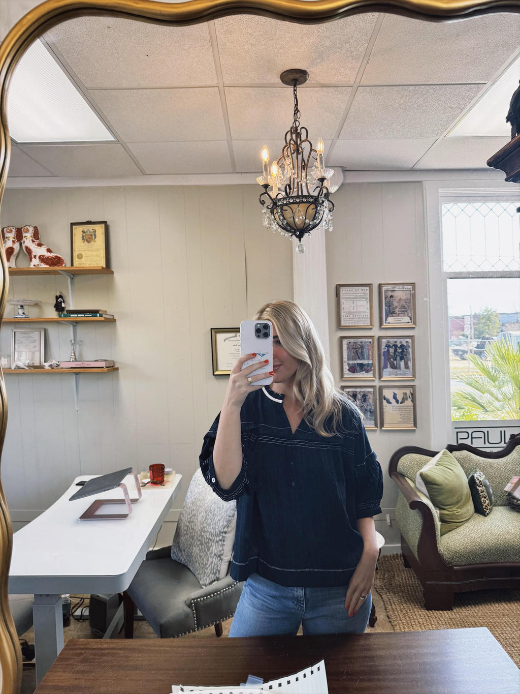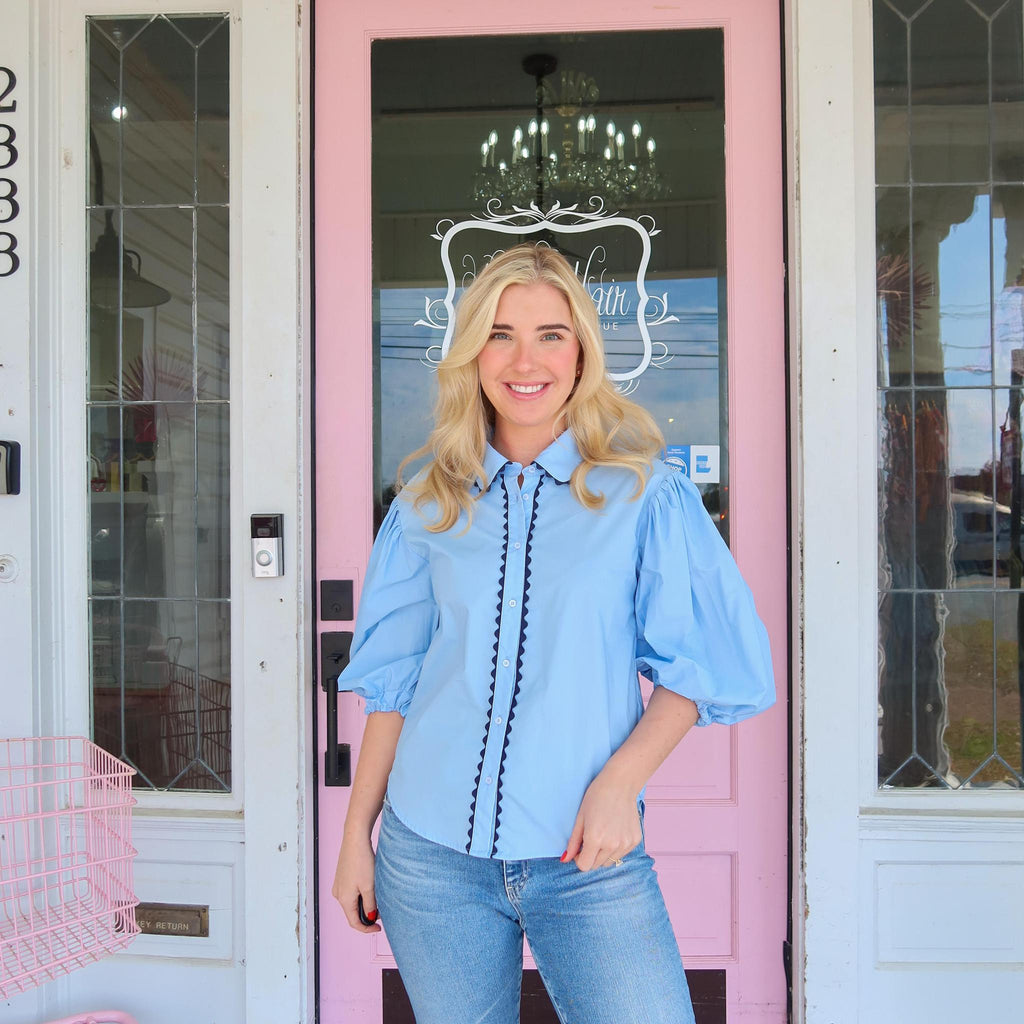 Karlie Blue Poplin Top With Contrast Ric-Rac Trim!