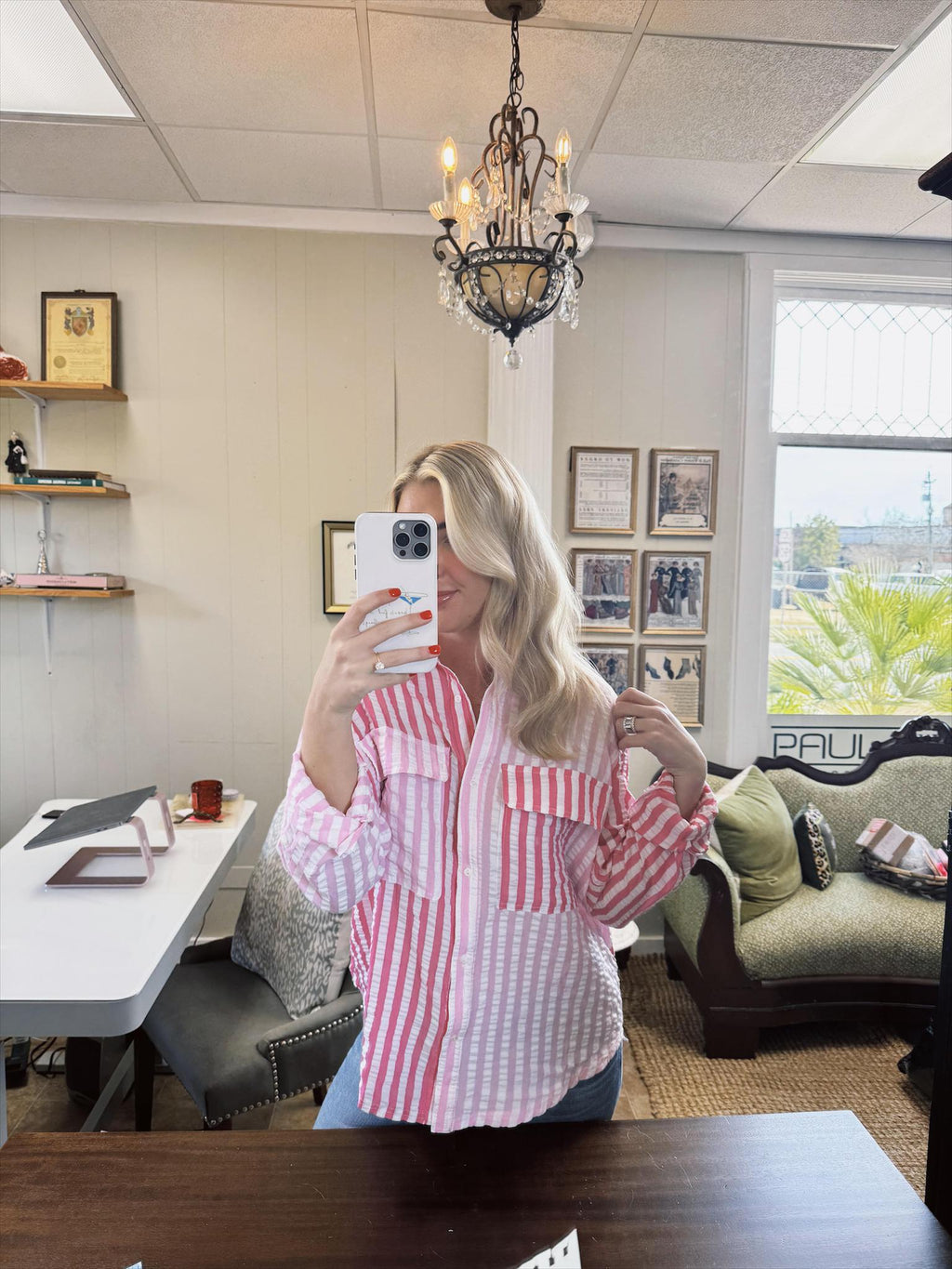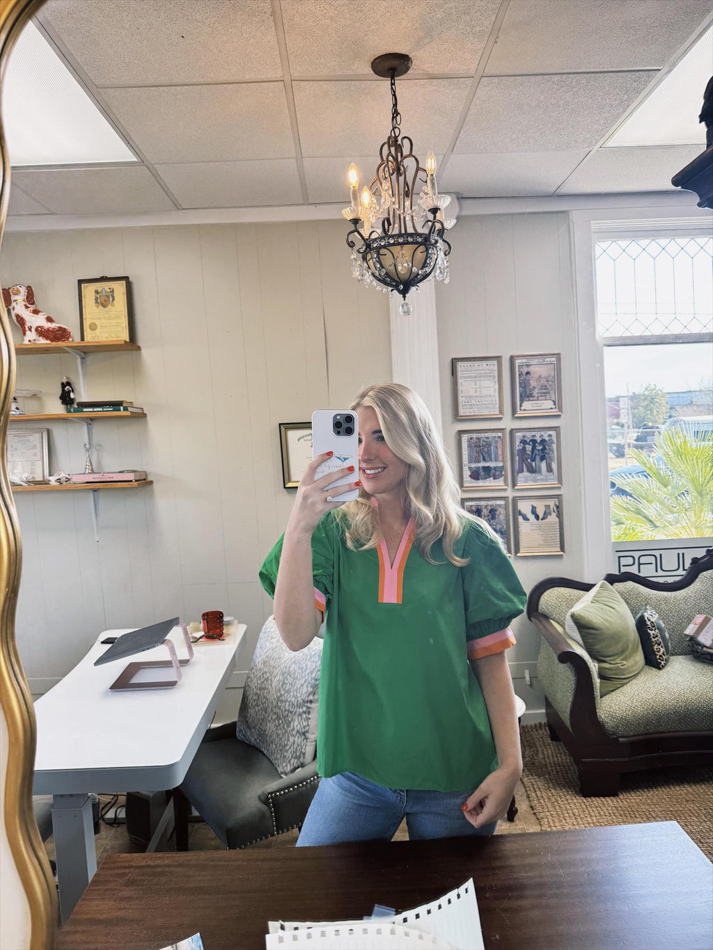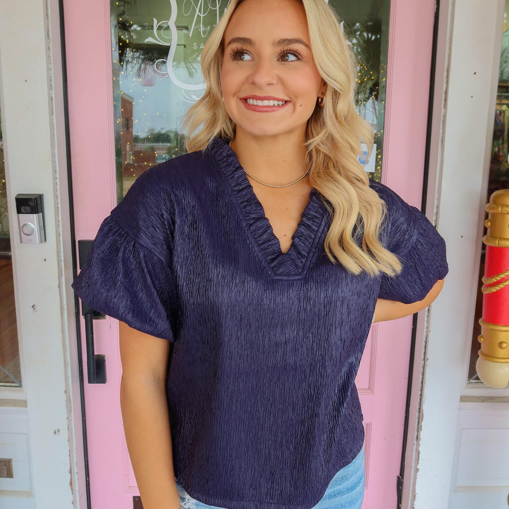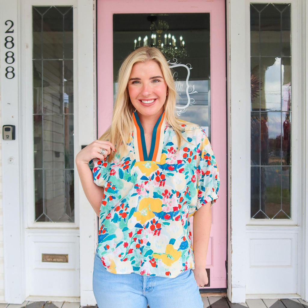 Karlie Blue Poplin Top With Contrast Ric-Rac Trim!