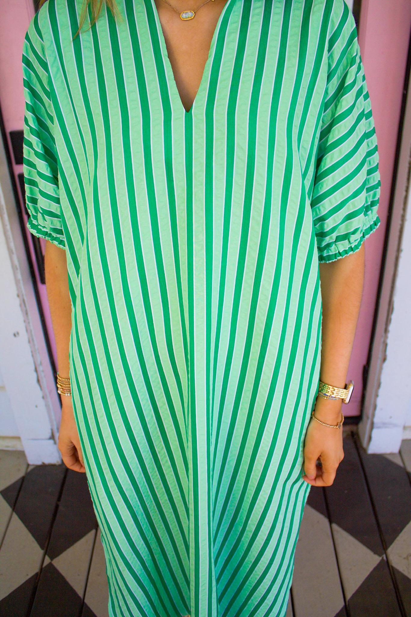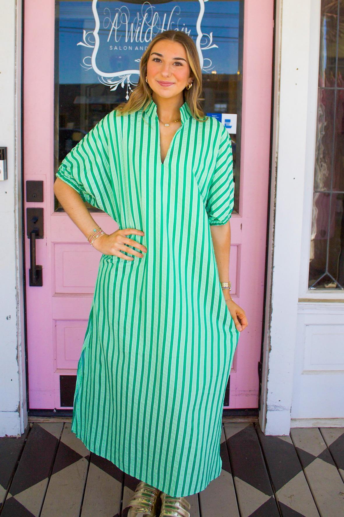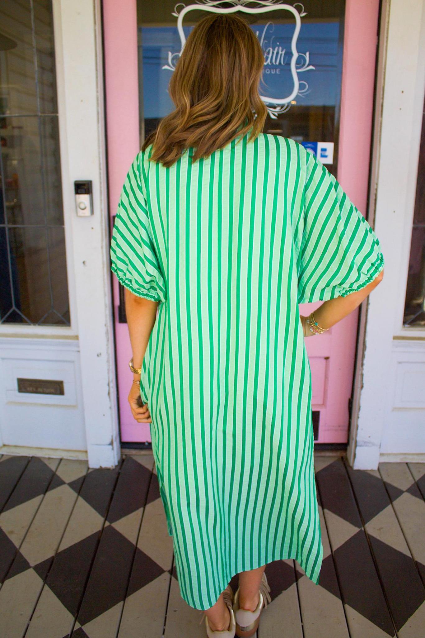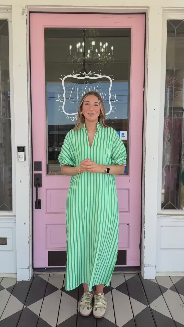 Striped short sleeve midi dress featuring collared V-neck and cuffed sleeves. Side pockets. Lined. Woven. Non-sheer. Lightweight.